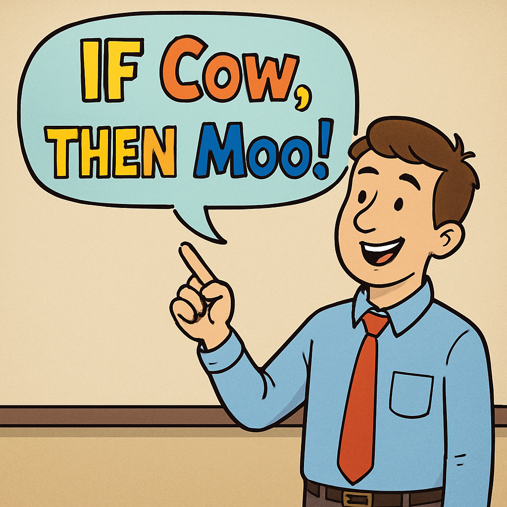 Put your hands together and say the complete rule clearly: IF the Cow is said, THEN you must Moo!