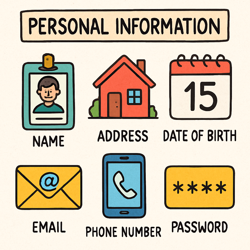 In this step, we will examine various examples of personal information. Understanding these examples will help you recognise what details about yourself should be kept private to ensure your safety online.